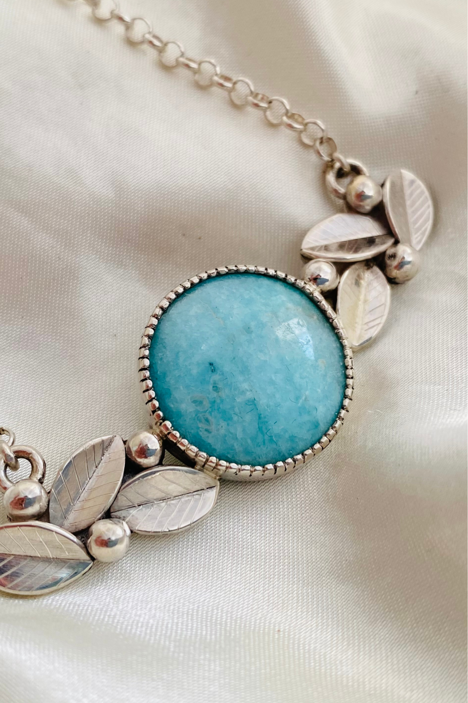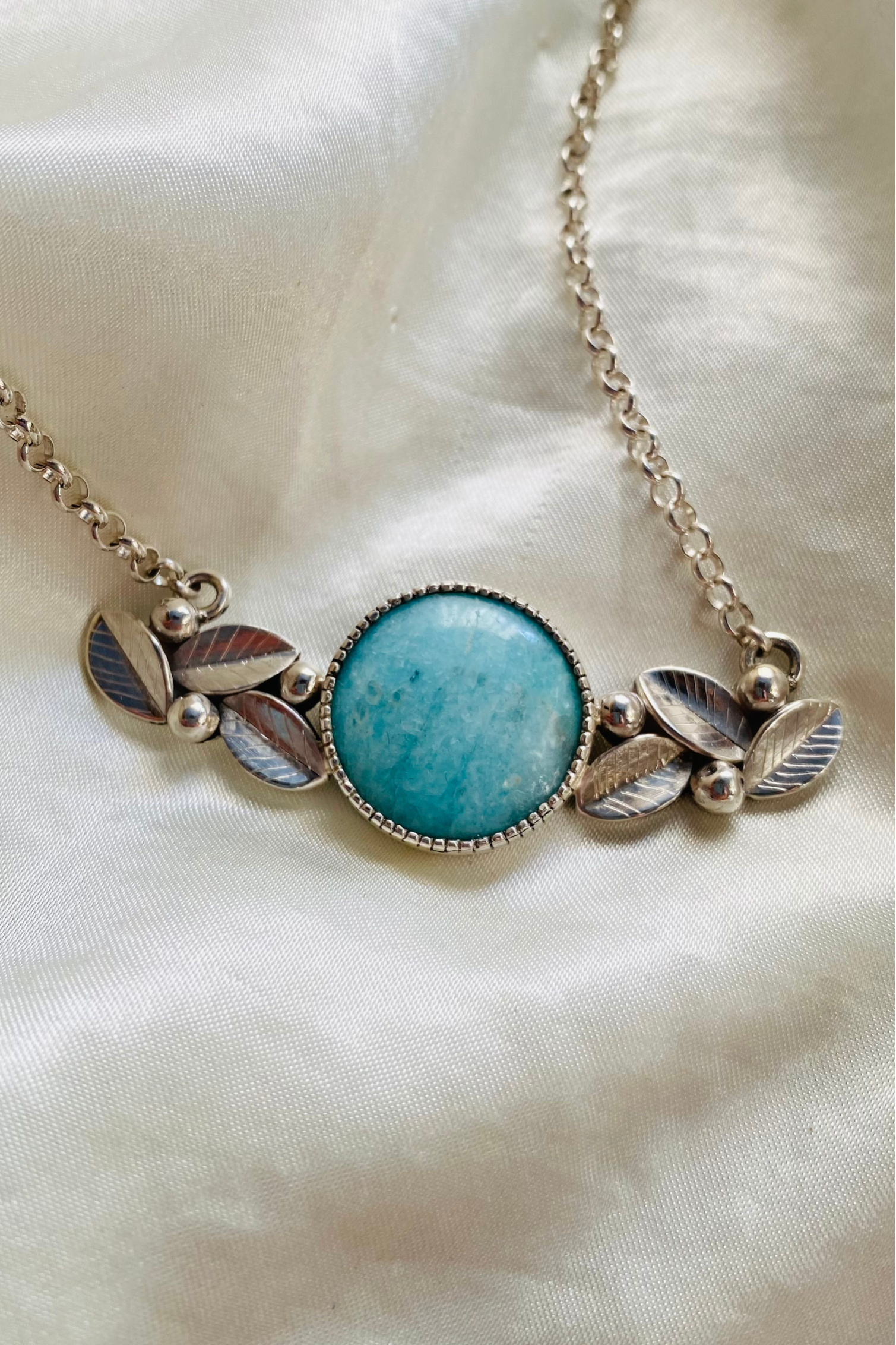‣ De nuestra colección Esencia Natura, este colgante tiene hojitas grabadas a mano, que acompañan esa linda Amazonita, de un tono verde claro, que como todas las piedras de esta tonalidad, se cree que armoniza y tranquiliza el espíritu. Un engaste a modo de decoración, que destaca aún más la piedra.