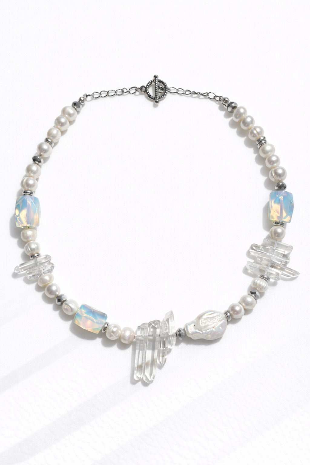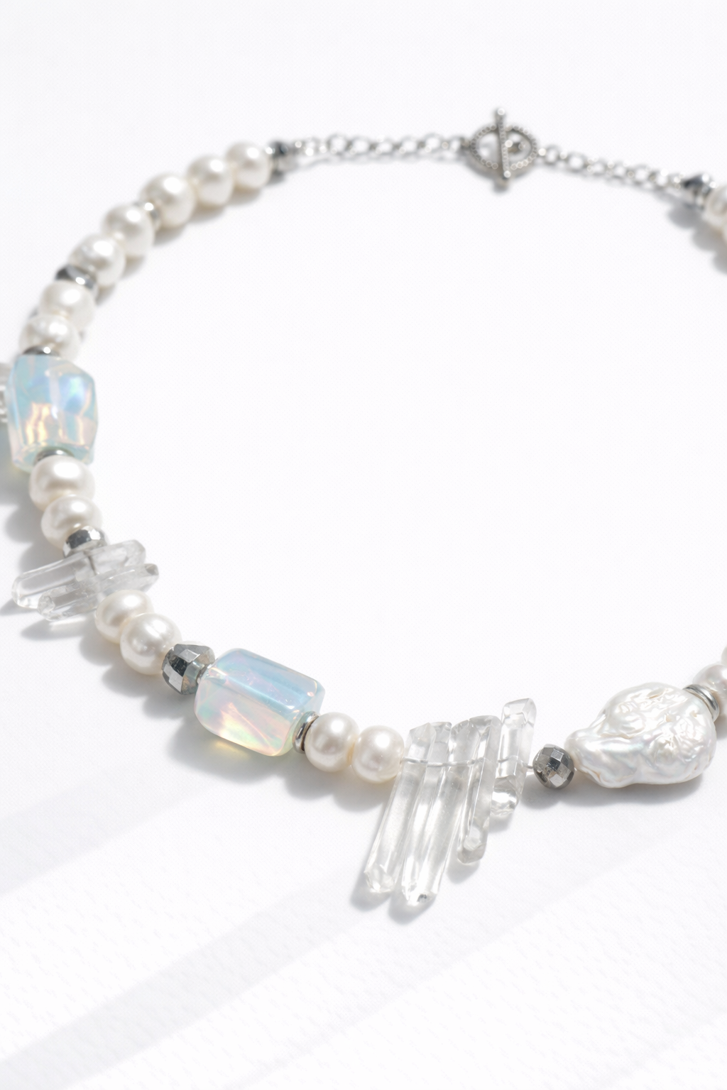 ‣ Material: Collar de cuentas de piedras de cuarzo blanco con dos tipos de perlas de agua dulce y otras de plástico.